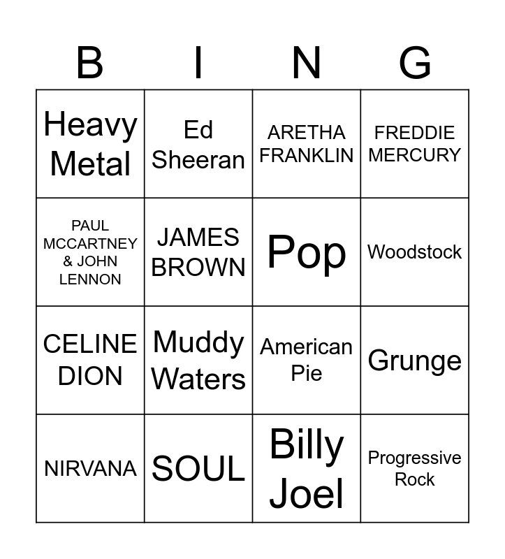 This bingo card has 33 words: ABBA, ELVIS PRESLEY, Grunge, MICHAEL JACKSON, Progressive Rock, Pop, PAUL MCCARTNEY & JOHN LENNON, Soul, Ed Sheeran, Punk, Woodstock, ARETHA FRANKLIN, ELTON JOHN, Surf, SOUL, Muddy Waters, Motown, American Pie, Village People, Bill Haley & the Comets, Hair Bands, Dance, Heavy Metal, Billy Joel, One Hit Wonders, NIRVANA, FREDDIE MERCURY, CELINE DION, JAMES BROWN, BUDDY HOLLY, DIANA ROSS, RAY CHARLES and LITTLE RICHARD.