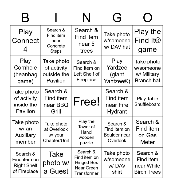 This bingo card has a free space and 25 words: Take photo at Overlook w/ your Chapter/Unit, Search & Find item on Hinged Box Near Green Transformer, Search & Find item on Left Shelf of Fireplace, Search & Find item on Right Shelf of Fireplace, Play the Find It® game, Play Connect 4, Play Cornhole (beanbag game), Search & Find item near Concrete Steps, Search & Find item near Fire Hydrant, Play the Tower of Hanoi wooden puzzle, Play Yardzee (giant Yahtzee®), Take photo of activity inside the Pavilion, Search & Find item on Boulder near Overlook, Search & Find item on Gas Meter, Take photo of activity outside the Pavilion, Take photo w/ a DAV member, Play Table Shuffleboard, Search & Find item near 5 trees, Take photo w/someone w/ Military Branch hat, Search & Find item near BBQ Grill, Search & Find item near White Birch Trees, Take photo w/ a Guest, Take photo w/ an Auxiliary member, Take photo w/someone w/ DAV hat and Take photo w/someone w/ DAV shirt.