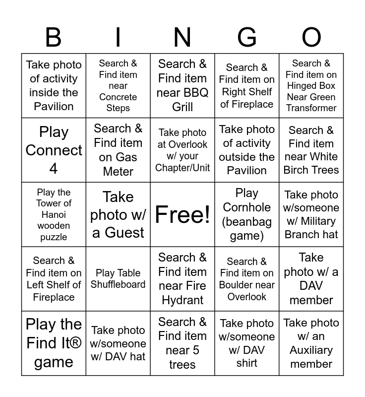 This bingo card has a free space and 25 words: Play Table Shuffleboard, Search & Find item near 5 trees, Take photo at Overlook w/ your Chapter/Unit, Play the Find It® game, Search & Find item on Hinged Box Near Green Transformer, Take photo of activity inside the Pavilion, Play Connect 4, Search & Find item near Concrete Steps, Play Cornhole (beanbag game), Search & Find item near Fire Hydrant, Take photo of activity outside the Pavilion, Play the Tower of Hanoi wooden puzzle, Search & Find item on Boulder near Overlook, Take photo w/ a DAV member, Search & Find item on Gas Meter, Play Yardzee (giant Yahtzee®), Take photo w/someone w/ Military Branch hat, Search & Find item near BBQ Grill, Search & Find item near White Birch Trees, Take photo w/ a Guest, Take photo w/ an Auxiliary member, Take photo w/someone w/ DAV hat, Search & Find item on Left Shelf of Fireplace, Search & Find item on Right Shelf of Fireplace and Take photo w/someone w/ DAV shirt.
