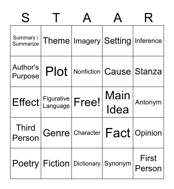 This bingo card has a free space and 24 words: Genre, Fiction, Nonfiction, Poetry, Inference, Summary / Summarize, Author's Purpose, Theme, Main Idea, Character, Cause, Effect, Fact, Opinion, Plot, Synonym, Antonym, Imagery, Stanza, Figurative Language, First Person, Third Person, Setting and Dictionary.