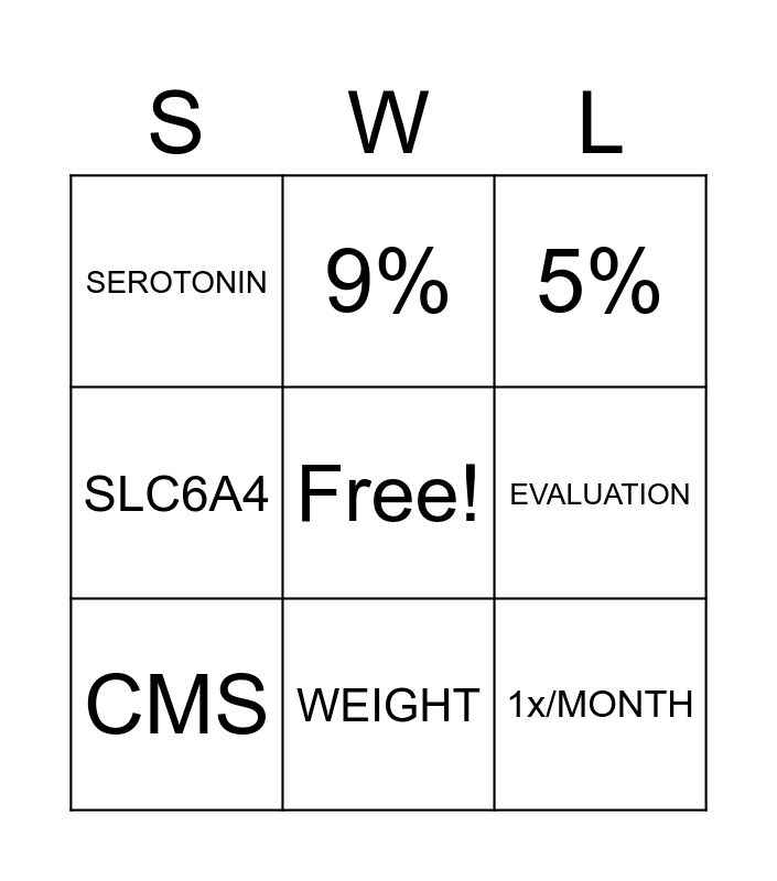 This bingo card has a free space and 11 words: BMI, WEIGHT, 1x/MONTH, CMS, 9%, 5%, EVALUATION, MNA, SLC6A4, SEROTONIN and EDUCATION.