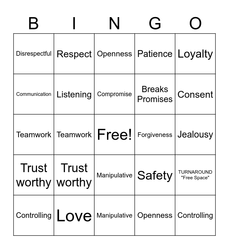 This bingo card has a free space and 49 words: Consent, Controlling, Abusive, Manipulative, Trust worthy, Boundaries, Respect, Isolation, Communication, Love, Listening, Patience, TURNAROUND "Free Space", Safety, Jealousy, Blaming, Compromise, Forgiveness, Support, Loyalty, Teamwork, Openness, Disrespectful, Breaks Promises, Empathy, Consent, Controlling, Abusive, Manipulative, Trust worthy, Boundaries, Respect, Isolation, Communication, Love, Listening, Patience, Safety, Jealousy, Blaming, Compromise, Forgiveness, Support, Loyalty, Teamwork, Openness, Disrespectful, Breaks Promises and Empathy.