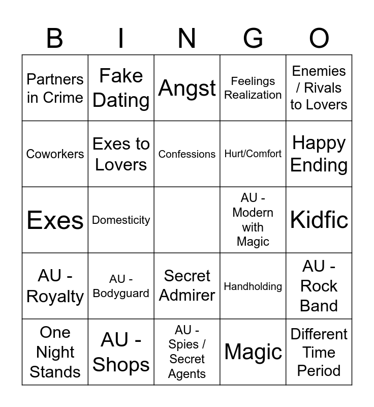 This bingo card has a free space and 76 words: 3+1 / 5+1 Times, A/B/O Elements, Angst, Angst and Fluff, Animals / Pets, Arranged Marriage, Based on Other Media, Blind Date, Canon Compliant, Celestial Beings, Childhood Friends, Childhood Sweethearts, Confessions, Coworkers, Dares, Domesticity, Didn’t Know They Were Dating, Different Time Period, Dreams, Enemies / Rivals to Lovers, Established Relationship, Exes, Exes to Lovers, Fake Dating, Feelings Realization, Firsts, Fluff, Food / Cooking, Forbidden Love, Found Family, Friends With Benefits, Friends to Lovers, Ghosts / Paranormal, Handholding, Happy Ending, Hurt/Comfort, Hybrids, Idiots in Love, Kidfic, Magic, Marriage / Married Life / Weddings, Marriage of Convenience, Mistaken Identity, Mutual Pining, Nature Imagery, Neighbors, One Night Stands, Partners in Crime, Pining, Rivals with Benefits, Roommates, Secret Admirer, Sharing a Bed, Sickfic, Slice of Life, Slow Burn, Soulmates, Strangers to Lovers, Supernatural Elements, Time (Travel, Loops, etc.), AU - Bodyguard, AU - Canon Divergent, AU - College / University, AU - Fantasy, AU - Inspired by SKZ MV, AU - Modern, AU - Modern with Magic, AU - Non-Idol Celebrity, AU - Office, AU - Reincarnation, AU - Rock Band, AU - Royalty, AU - Shops, AU - Small Town, AU - Spies / Secret Agents and AU - Werewolves.