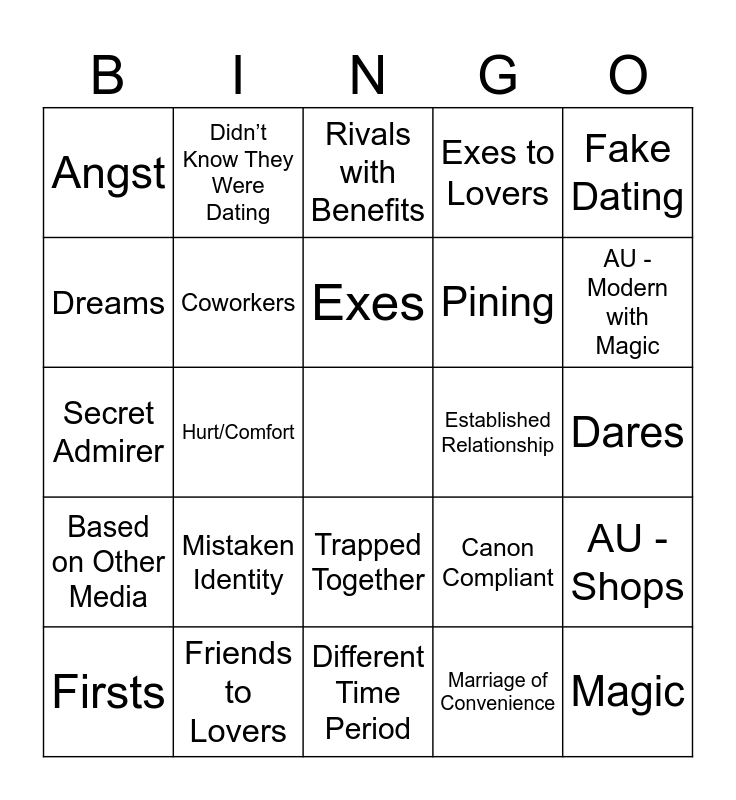 This bingo card has a free space and 73 words: 3+1 / 5+1 Times, A/B/O Elements, Angst, Angst and Fluff, Animals / Pets, Arranged Marriage, Based on Other Media, Blind Date, Canon Compliant, Childhood Friends, Childhood Sweethearts, Confessions, Coworkers, Dares, Domesticity, Didn’t Know They Were Dating, Different Time Period, Dreams, Enemies / Rivals to Lovers, Established Relationship, Exes, Exes to Lovers, Fake Dating, Feelings Realization, Firsts, Fluff, Food / Cooking, Forbidden Love, Found Family, Friends With Benefits, Friends to Lovers, Ghosts / Paranormal, Handholding, Happy Ending, Hurt/Comfort, Hybrids, Idiots in Love, Kidfic, Magic, Marriage / Married Life / Weddings, Marriage of Convenience, Mistaken Identity, Neighbors, One Night Stands, Partners in Crime, Pining, Rivals with Benefits, Road Trip, Roommates, Secret Admirer, Sharing a Bed, Sickfic, Slice of Life, Soulmates, Strangers to Lovers, Supernatural Elements, Time (Travel, Loops, etc.), Trapped Together, AU - Bodyguard, AU - College / University, AU - Fantasy, AU - Inspired by SKZ MV, AU - Modern, AU - Modern with Magic, AU - Non-Idol Celebrity, AU - Office, AU - Rock Band, AU - Royalty, AU - Shops, AU - Small Town, AU - Space, AU - Spies / Secret Agents and AU - Vampires.