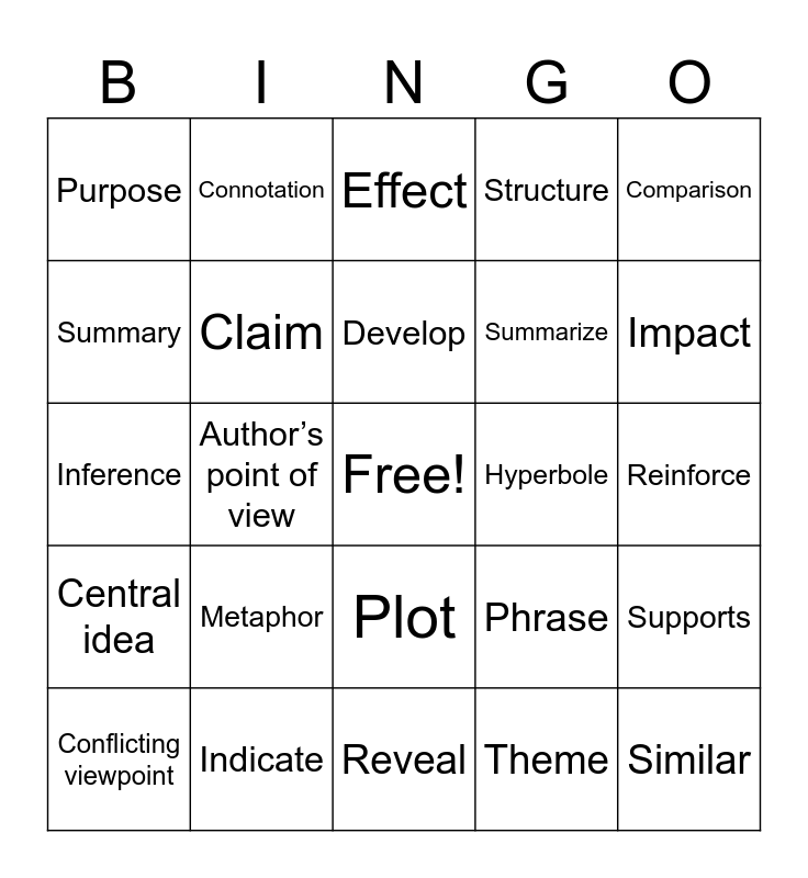 This bingo card has a free space and 33 words: Accurate, Acknowledge, Author’s point of view, Author’s purpose, Central idea, Claim, Comparison, Conflicting viewpoint, Connotation, Contribute, Develop, Effect, Emphasize, Figurative language, Hyperbole, Impact, Indicate, Inference, Metaphor, Phrase, Plot, Propel the action, Purpose, Reinforce, Reveal, Similar, Structure, Summarize, Summary, Supports, Suspense, Theme and Tone.
