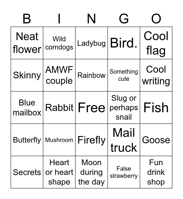 This bingo card has a free space and 24 words: Mushroom, Heart or heart shape, Rainbow, Secrets, Cool flag, Neat flower, Skinny, Wild corndogs, Slug or perhaps snail, Firefly, Something cute, Blue mailbox, Mail truck, Goose, AMWF couple, False strawberry, Fish, Ladybug, Cool writing, Rabbit, Fun drink shop, Butterfly, Bird. and Moon during the day.