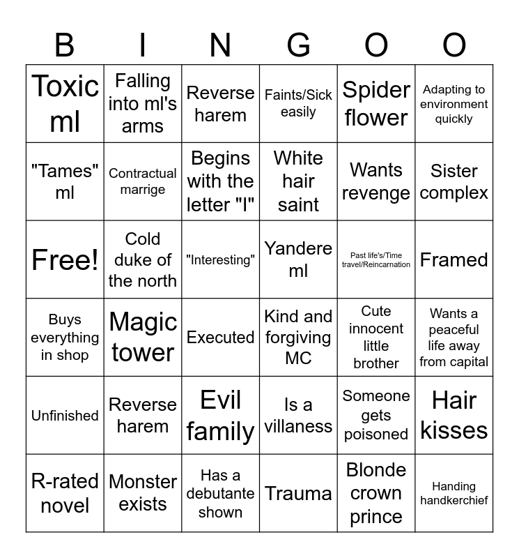 This bingo card has 36 words: Is a villaness, Evil family, Trauma, "Tames" ml, Buys everything in shop, Yandere ml, Contractual marrige, Has a debutante shown, Spider flower, Someone gets poisoned, Sister complex, Faints/Sick easily, Hair kisses, Cold duke of the north, White hair saint, Toxic ml, Unfinished, Past life's/Time travel/Reincarnation, Free!, Reverse harem, "Interesting", Magic tower, Kind and forgiving MC, Executed, Cute innocent little brother, Falling into ml's arms, Wants revenge, Monster exists, Begins with the letter "I", Adapting to environment quickly, Handing handkerchief, R-rated novel, Wants a peaceful life away from capital, Framed, Reverse harem and Blonde crown prince.