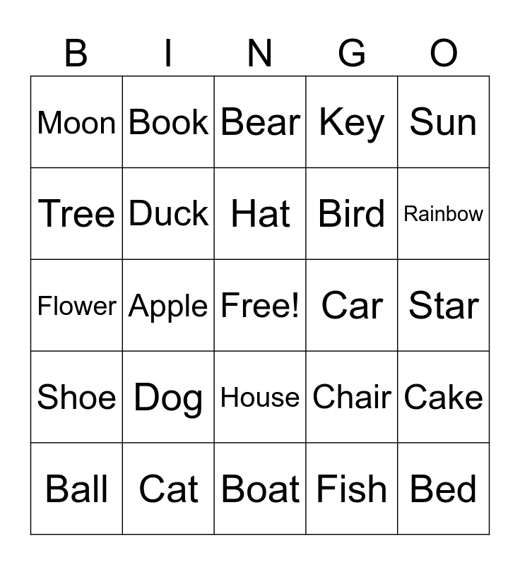 This bingo card has a free space and 24 words: Dog, Cat, Hat, Ball, Sun, Moon, Tree, Book, Car, House, Bird, Flower, Chair, Cake, Duck, Fish, Star, Bear, Rainbow, Apple, Bed, Shoe, Key and Boat.