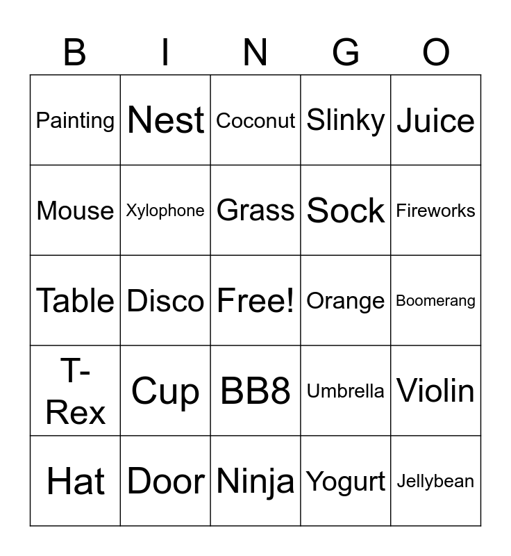 This bingo card has a free space and 24 words: Cup, Door, Grass, Hat, Juice, Painting, Mouse, Nest, Orange, BB8, Sock, Table, Umbrella, Violin, Xylophone, Yogurt, Boomerang, Coconut, Fireworks, Disco, Jellybean, T-Rex, Slinky and Ninja.
