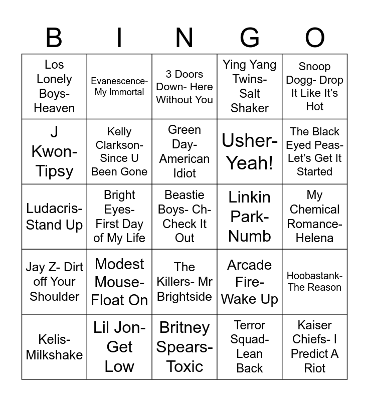 This bingo card has 28 words: Hoobastank- The Reason, Outkast- Hey Ya, Usher- Yeah!, Terror Squad- Lean Back, J Kwon- Tipsy, 3 Doors Down- Here Without You, Evanescence- My Immortal, Jay Z- Dirt off Your Shoulder, Linkin Park- Numb, Kelis- Milkshake, Ludacris- Stand Up, Ying Yang Twins- Salt Shaker, Lil Jon- Get Low, Britney Spears- Toxic, The Black Eyed Peas- Let’s Get It Started, Franz Ferdinand- Take Me Out, Modest Mouse- Float On, Kelly Clarkson- Since U Been Gone, Green Day- American Idiot, The Killers- Mr Brightside, Los Lonely Boys- Heaven, Kaiser Chiefs- I Predict A Riot, Beastie Boys- Ch-Check It Out, Bright Eyes- First Day of My Life, My Chemical Romance- Helena, Arcade Fire- Wake Up, Snoop Dogg- Drop It Like It’s Hot and U2- Vertigo.