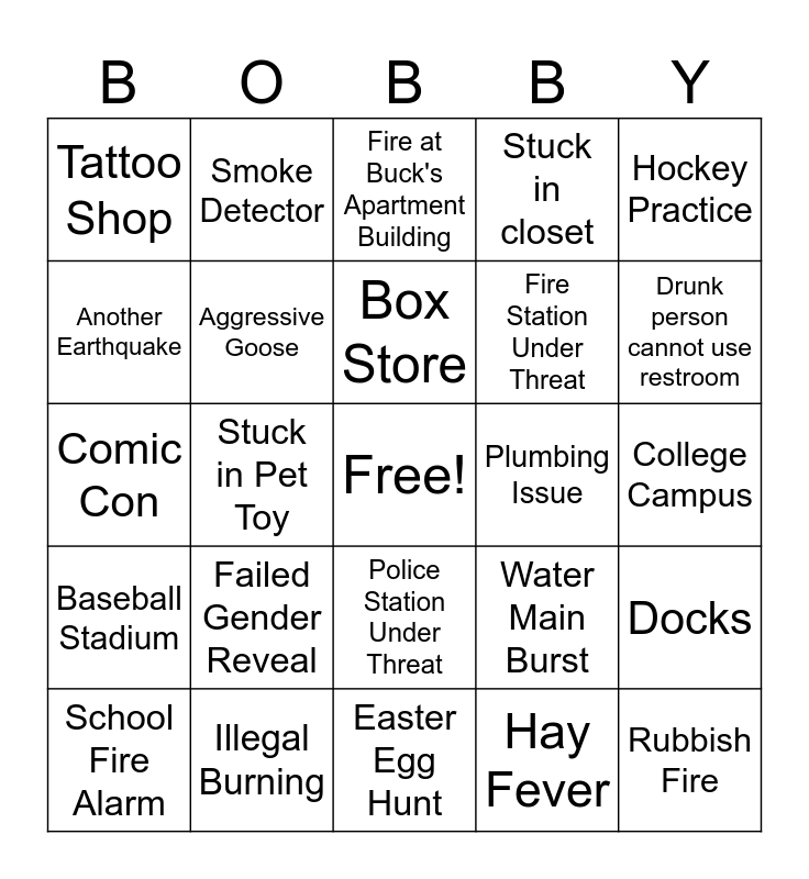 This bingo card has a free space and 24 words: Failed Gender Reveal, Illegal Burning, Box Store, School Fire Alarm, Hockey Practice, Tattoo Shop, Another Earthquake, Smoke Detector, Plumbing Issue, Police Station Under Threat, Fire Station Under Threat, Comic Con, Water Main Burst, Docks, Aggressive Goose, Hay Fever, College Campus, Fire at Buck's Apartment Building, Drunk person cannot use restroom, Stuck in Pet Toy, Rubbish Fire, Baseball Stadium, Stuck in closet and Easter Egg Hunt.