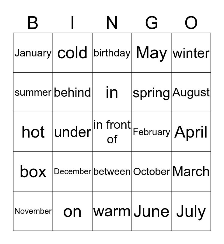 This bingo card has 30 words: on, fall, under, next to, January, birthday, behind, between, February, warm, April, in front of, June, July, August, bag, October, box, December, winter, hot, cool, cold, spring, summer, May, March, November, in and September.