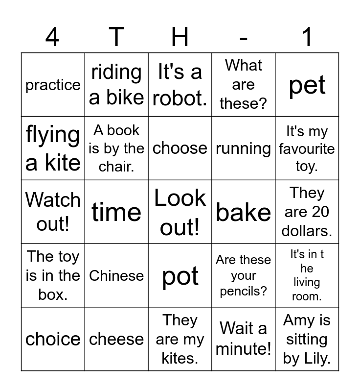 This bingo card has a free space and 24 words: Chinese, cheese, choose, choice, pet, practice, flying a kite, riding a bike, bake, pot, running, Watch out!, Are these your pencils?, It's in the living room., A book is by the chair., Wait a minute!, They are 20 dollars., It's a robot., It's my favourite toy., time, Amy is sitting by Lily., The toy is in the box., What are these? and They are my kites..