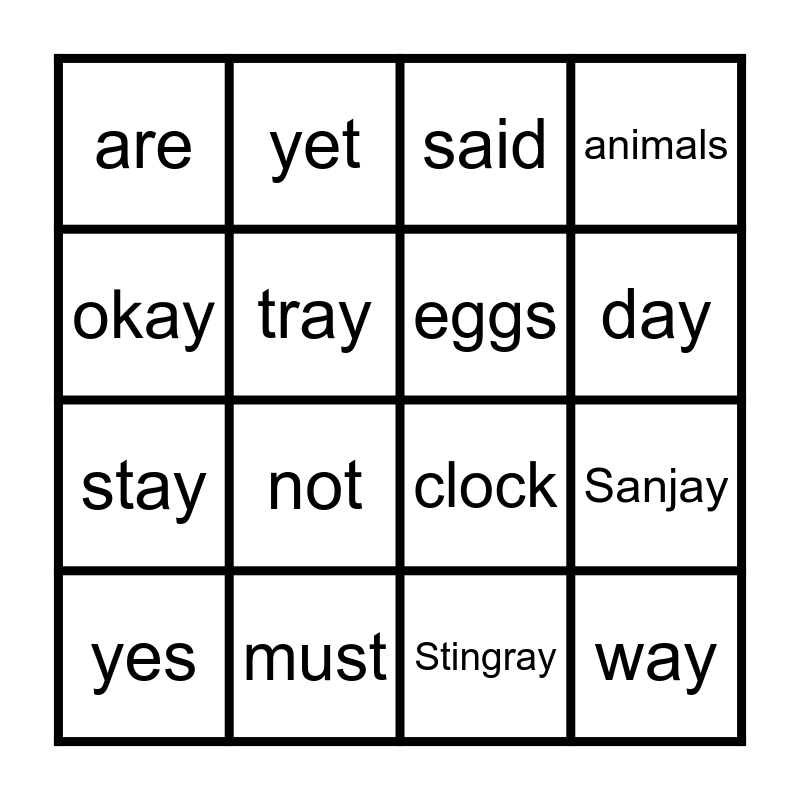 This bingo card has 20 words: Sanjay, play, said, ring, yes, okay, must, are, stay, yet, not, clock, tray, way, eggs, you, day, animals, Stingray and milk.