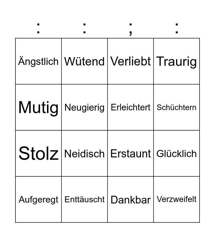This bingo card has 16 words: Enttäuscht, Glücklich, Verliebt, Ängstlich, Stolz, Wütend, Erstaunt, Dankbar, Mutig, Neugierig, Aufgeregt, Traurig, Neidisch, Schüchtern, Erleichtert and Verzweifelt.