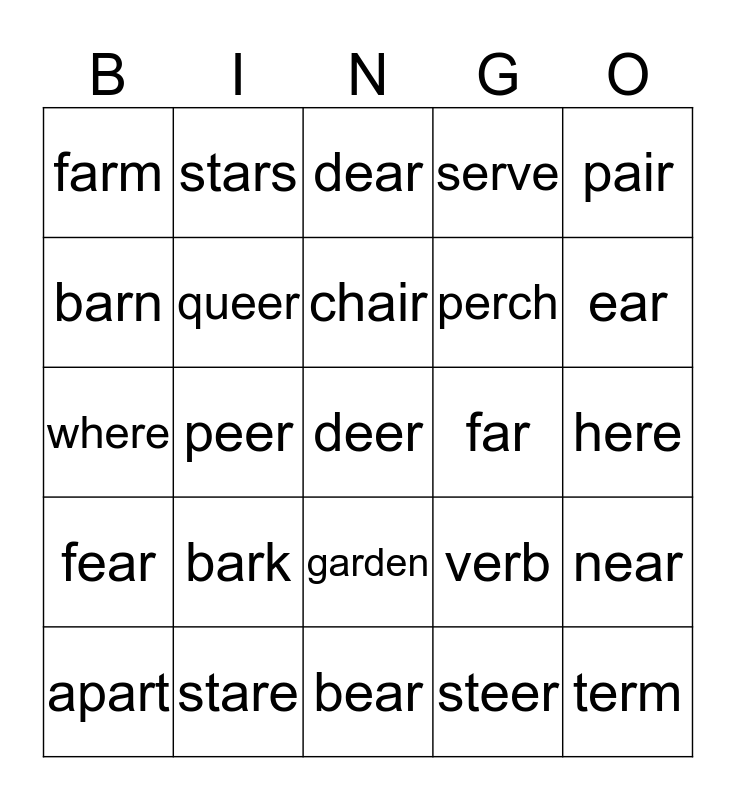 This bingo card has a free space and 24 words: bark, stare, chair, apart, pair, farm, barn, stars, far, garden, perch, where, verb, near, queer, steer, here, dear, ear, peer, term, fear, serve and bear.