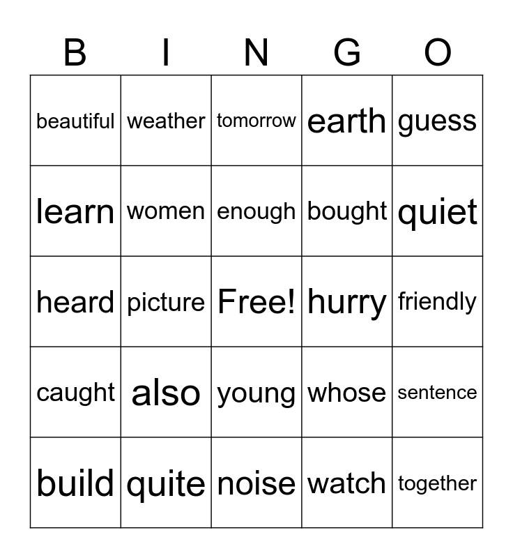 This bingo card has a free space and 24 words: also, quite, enough, build, guess, beautiful, learn, weather, hurry, young, bought, heard, whose, sentence, women, watch, friendly, tomorrow, quiet, picture, together, caught, earth and noise.