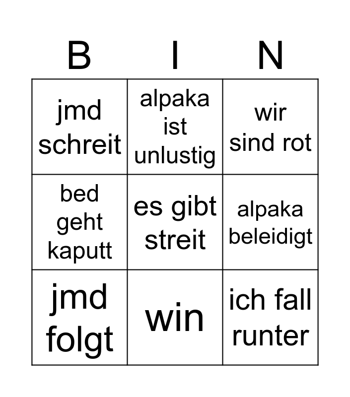 This bingo card has a free space and 8 words: alpaka beleidigt, wir sind rot, alpaka ist unlustig, jmd folgt, jmd schreit, ich fall runter, bed geht kaputt and win.