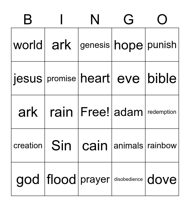 This bingo card has a free space and 24 words: Sin, flood, heart, god, punish, world, jesus, ark, adam, cain, eve, ark, animals, rainbow, promise, disobedience, redemption, genesis, bible, rain, dove, creation, hope and prayer.