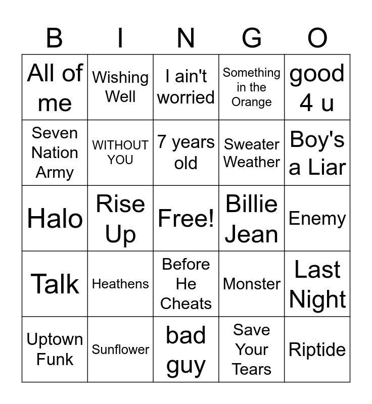 This bingo card has a free space and 24 words: Heathens, Sunflower, 7 years old, Uptown Funk, good 4 u, All of me, Seven Nation Army, Wishing Well, Billie Jean, Before He Cheats, Sweater Weather, Halo, Monster, Last Night, WITHOUT YOU, Save Your Tears, Enemy, I ain't worried, Boy's a Liar, Rise Up, Riptide, Talk, Something in the Orange and bad guy.