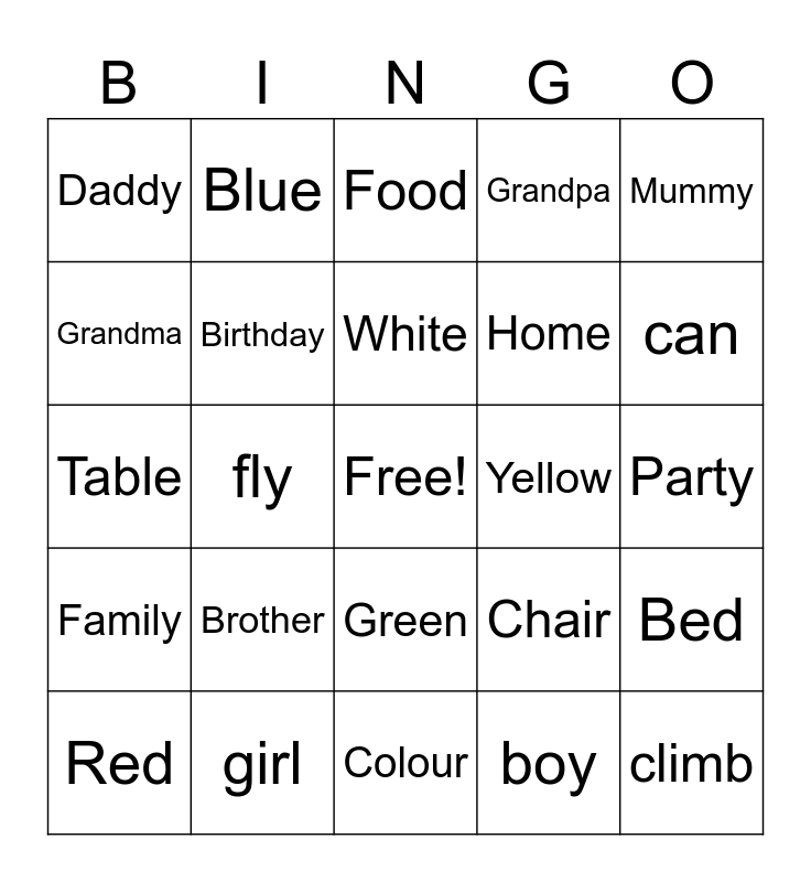 This bingo card has a free space and 25 words: Brother, Colour, White, Red, Mummy, Daddy, Grandma, Blue, Yellow, Green, Home, Table, Chair, Bed, Birthday, Candles, Party, Food, сan, fly, climb, girl, Family, Grandpa and boy.