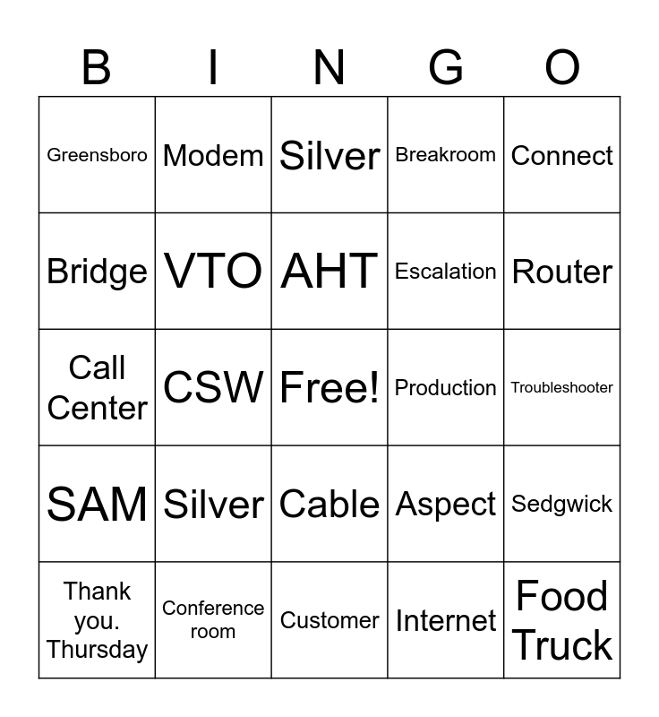 This bingo card has a free space and 27 words: Aspect, Account Number, Escalation, Customer, Bridge, Silver, Modem, SAM, Production, Sedgwick, Call Center, Breakroom, Thank you. Thursday, Conference room, Router, Zoomo, VTO, AHT, Silver, Greensboro, Troubleshooter, Internet, CSW, Food Truck, Cable, Connect and Progres partner.