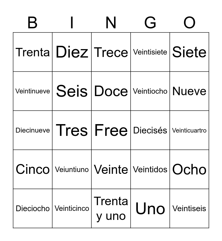 This bingo card has a free space and 32 words: Uno, Dos, Tres, Cuartro, Cinco, Seis, Siete, Ocho, Diez, Once, Doce, Trece, Catorse, Quince, Diecisés, Diecisiete, Dieciocho, Diecinueve, Veinte, Veiuntiuno, Veintidos, Veintitres, Veinticuartro, Veinticinco, Veintiseis, Veintisiete, Veintiocho, Veintinueve, Trenta, Trenta y uno, Trenta y dos and Nueve.