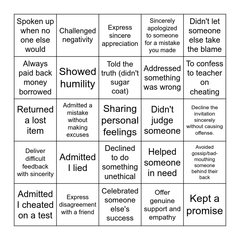 This bingo card has 25 words: Admitted I lied, Celebrated someone else's success, Told the truth (didn't sugar coat), Admitted I cheated on a test, Didn't let someone else take the blame, Spoken up when no one else would, Always paid back money borrowed, Challenged negativity, Didn't judge someone, Declined to do something unethical, Addressed something was wrong, Returned a lost item, Helped someone in need, Avoided gossip/bad-mouthing someone behind their back, Showed humility, Kept a promise, Decline the invitation sincerely without causing offense., Express sincere appreciation, To confess to teacher on cheating, Admitted a mistake without making excuses, Sharing personal feelings, Express disagreement with a friend, Deliver difficult feedback with sincerity, Sincerely apologized to someone for a mistake you made and Offer genuine support and empathy.