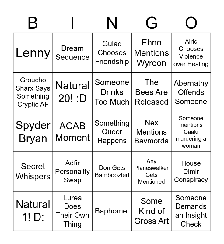 This bingo card has a free space and 24 words: Adfir Personality Swap, Lurea Does Their Own Thing, Someone Drinks Too Much, Natural 1! D:, Alric Chooses Violence over Healing, Lenny, Groucho Sharx Says Something Cryptic AF, Dream Sequence, Nex Mentions Bavmorda, Don Gets Bamboozled, The Bees Are Released, Spyder Bryan, Any Planeswalker Gets Mentioned, House Dimir Conspiracy, Natural 20! :D, Some Kind of Gross Art, Someone mentions Caaki murdering a woman, Gulad Chooses Friendship, Abernathy Offends Someone, ACAB Moment, Someone Demands an Insight Check, Secret Whispers, Ehno Mentions Wyroon and Baphomet.