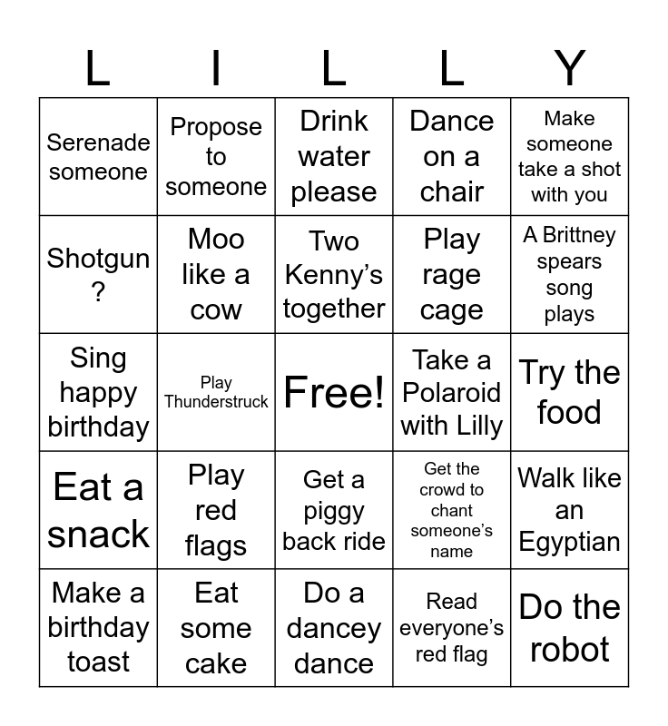 This bingo card has a free space and 25 words: Play red flags, Do a dancey dance, Two Kenny’s together, Make a birthday toast, Make someone take a shot with you, Serenade someone, Shotgun ?, Propose to someone, Take a Polaroid with Lilly, Get a piggy back ride, Play rage cage, Sing happy birthday, Get the crowd to chant someone’s name, Walk like an Egyptian, Moo like a cow, Give Lilly your best pickup line, Try the food, Drink water please, A Brittney spears song plays, Play Thunderstruck, Do the robot, Eat some cake, Eat a snack, Dance on a chair and Read everyone’s red flag.