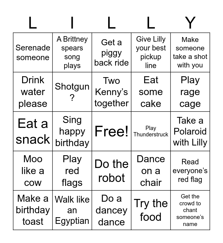 This bingo card has a free space and 25 words: Play red flags, Do a dancey dance, Two Kenny’s together, Make a birthday toast, Make someone take a shot with you, Serenade someone, Drink water please, A Brittney spears song plays, Play Thunderstruck, Do the robot, Eat some cake, Eat a snack, Dance on a chair, Read everyone’s red flag, Shotgun ?, Propose to someone, Take a Polaroid with Lilly, Get a piggy back ride, Play rage cage, Sing happy birthday, Get the crowd to chant someone’s name, Walk like an Egyptian, Moo like a cow, Give Lilly your best pickup line and Try the food.