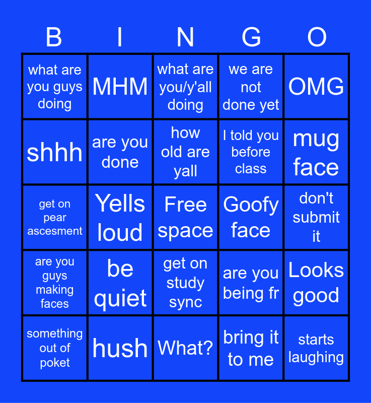 This bingo card has a free space and 24 words: be quiet, hush, how old are yall, something out of poket, OMG, what are you guys doing, shhh, MHM, Goofy face, get on study sync, I told you before class, get on pear ascesment, are you being fr, Looks good, are you done, bring it to me, don't submit it, what are you/y'all doing, mug face, Yells loud, starts laughing, are you guys making faces, we are not done yet and What?.