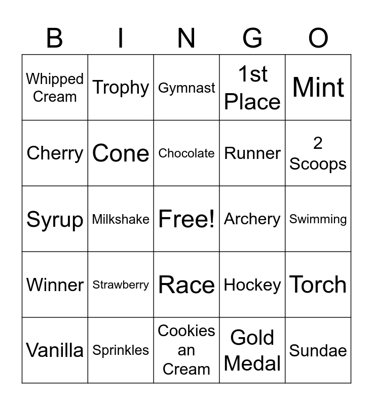 This bingo card has a free space and 24 words: Strawberry, Sprinkles, Chocolate, Vanilla, Mint, Whipped Cream, Cherry, Trophy, Archery, Race, Runner, Syrup, Hockey, Torch, Cone, Gold Medal, Swimming, Gymnast, 2 Scoops, Milkshake, Sundae, Winner, 1st Place and Cookies an Cream.