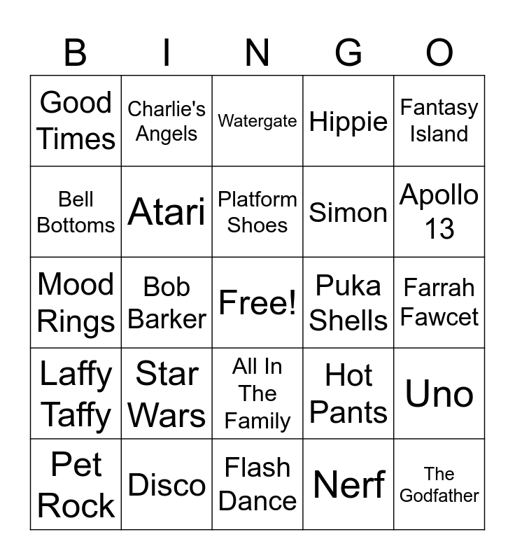 This bingo card has a free space and 24 words: Star Wars, Disco, Platform Shoes, Pet Rock, Fantasy Island, Good Times, Bell Bottoms, Charlie's Angels, Puka Shells, All In The Family, Simon, Mood Rings, Hot Pants, Uno, Atari, Nerf, Farrah Fawcet, Watergate, Apollo 13, Bob Barker, The Godfather, Laffy Taffy, Hippie and Flash Dance.