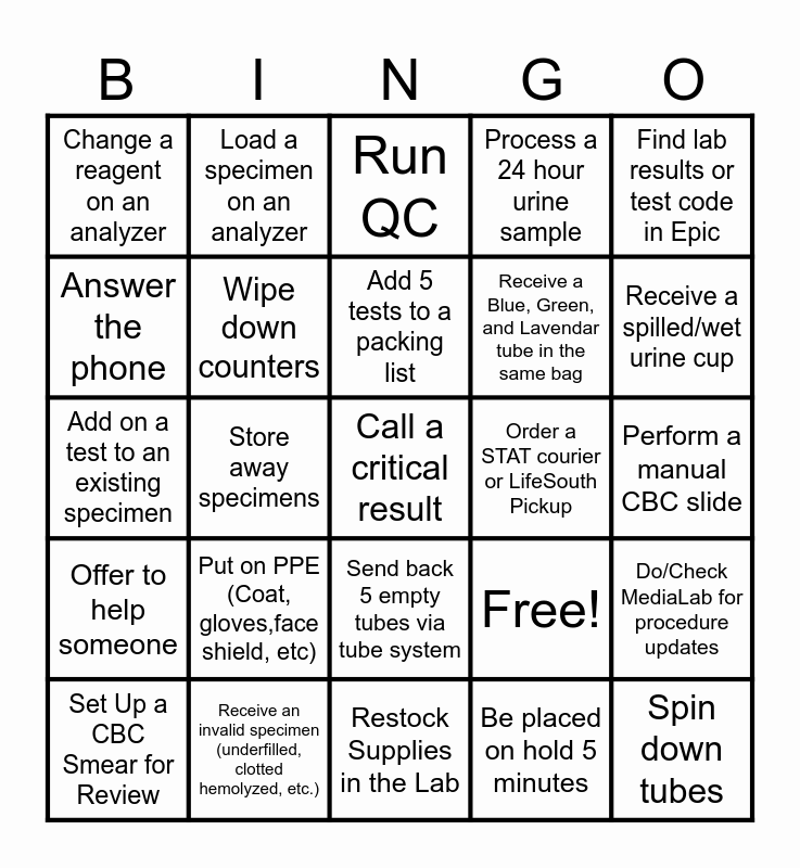 This bingo card has 25 words: Put on PPE (Coat, gloves,face shield, etc), Restock Supplies in the Lab, Add 5 tests to a packing list, Set Up a CBC Smear for Review, Find lab results or test code in Epic, Change a reagent on an analyzer, Answer the phone, Load a specimen on an analyzer, Order a STAT courier or LifeSouth Pickup, Send back 5 empty tubes via tube system, Receive a Blue, Green, and Lavendar tube in the same bag, Add on a test to an existing specimen, Free!, Do/Check MediaLab for procedure updates, Wipe down counters, Spin down tubes, Perform a manual CBC slide, Run QC, Receive a spilled/wet urine cup, Store away specimens, Call a critical result, Receive an invalid specimen (underfilled, clotted hemolyzed, etc.), Offer to help someone, Process a 24 hour urine sample and Be placed on hold 5 minutes.