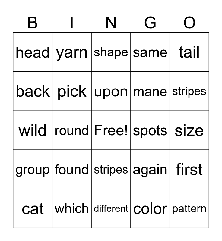 This bingo card has a free space and 24 words: found, which, upon, cat, tail, head, back, yarn, spots, stripes, mane, wild, again, first, pick, color, size, shape, stripes, round, pattern, group, same and different.
