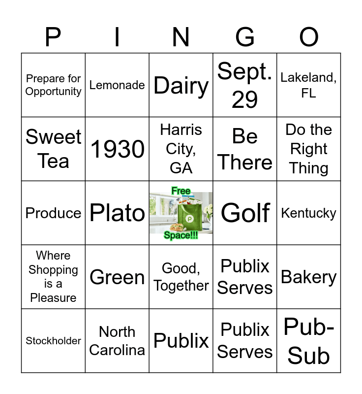 This bingo card has a free space and 48 words: Free Cookie, Pub-Sub, Mr. George, Publix, Green, GreenWise, Lemonade, “BOGO”, Sweet Tea, Winter Haven, FL, 1930, Sept. 29, Bakery, Publix Serves, Sept. 6, 1940, Harris City, GA, Golf, Lone Palm Golf Course, Lakeland, FL, Plato, Publix Serves, Prepare for Opportunity, Be There, Respect Individuals, Do the Right Thing, Stockholder, 100 Best Workplaces, Good, Together, Where Shopping is a Pleasure, Florida, Georgia, Alabama, South Carolina, North Carolina, Virginia, Tennessee, Kentucky, Grocery, Meat, Seafood, Deli, Dairy, Customer Service, Produce, No Tipping Please, Recycle Your Plastic Bags and Ice Cream.