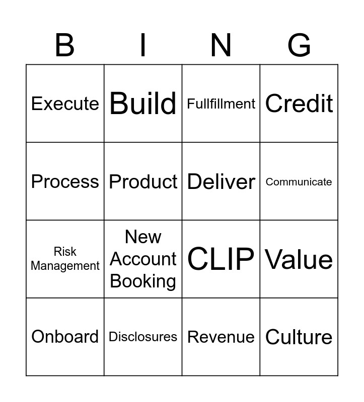 This bingo card has 17 words: Onboard, Disclosures, Fullfillment, Credit, Risk Management, Product, CLIP, Communicate, Process, New Account Booking, Revenue, Value, Execute, Build, Deliver, Culture and Free.