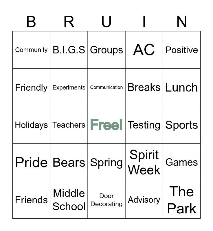 This bingo card has a free space and 24 words: Bears, Middle School, Communication, Friends, Positive, Community, Friendly, B.I.G.S, Testing, Spring, Breaks, Holidays, Spirit Week, Games, Experiments, Advisory, Sports, Groups, Lunch, Teachers, The Park, Pride, AC and Door Decorating.