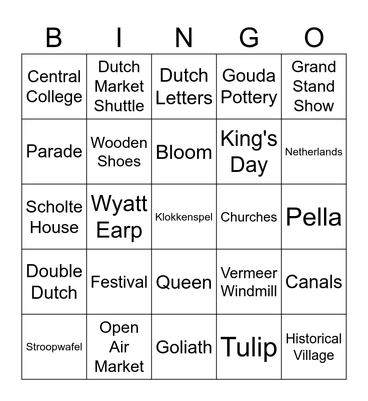 This bingo card has 25 words: Festival, Goliath, Bloom, Stroopwafel, Grand Stand Show, Central College, Parade, Dutch Market Shuttle, Churches, Queen, King's Day, Scholte House, Vermeer Windmill, Canals, Wooden Shoes, Historical Village, Pella, Dutch Letters, Netherlands, Wyatt Earp, Klokkenspel, Open Air Market, Double Dutch, Gouda Pottery and Tulip.