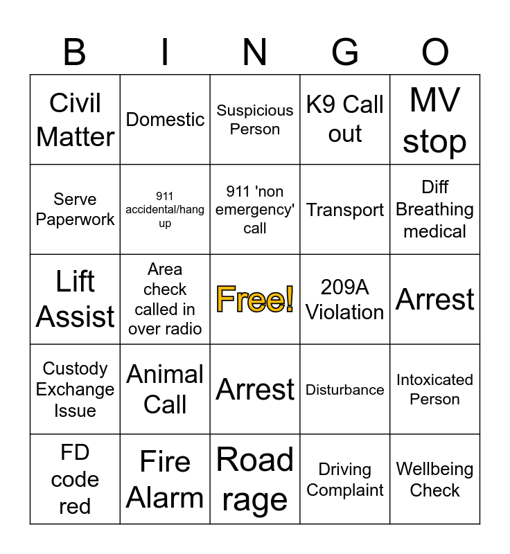 This bingo card has a free space and 24 words: Animal Call, Fire Alarm, 911 'non emergency' call, FD code red, MV stop, Civil Matter, Serve Paperwork, Domestic, 209A Violation, Arrest, Transport, Lift Assist, Disturbance, Intoxicated Person, 911 accidental/hang up, Driving Complaint, Arrest, Suspicious Person, Diff Breathing medical, Area check called in over radio, Wellbeing Check, Custody Exchange Issue, K9 Call out and Road rage.