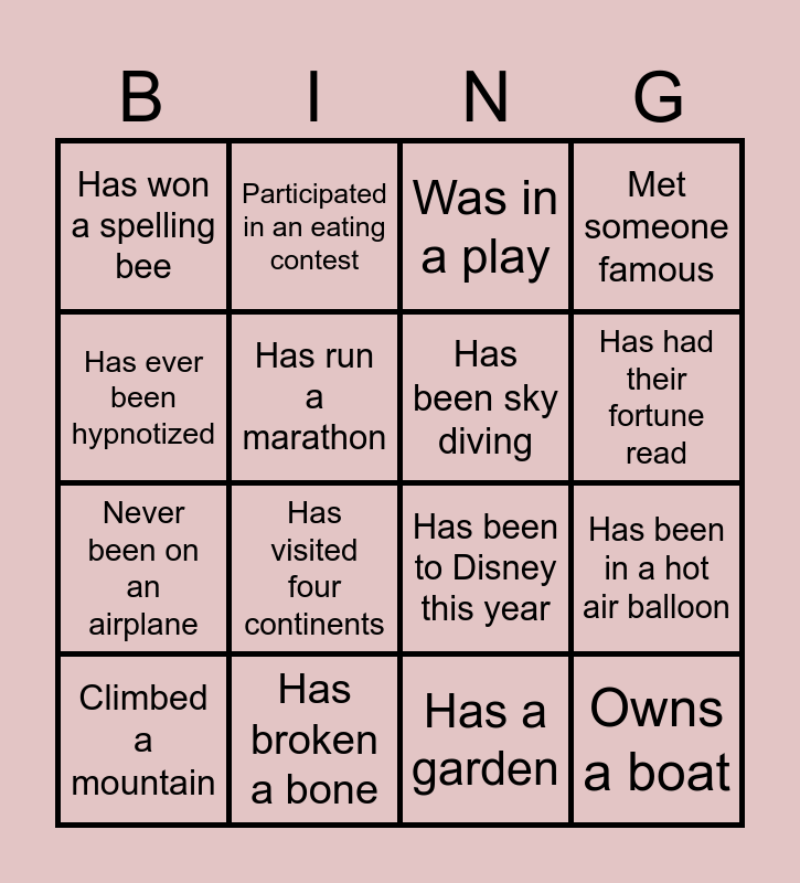 This bingo card has 16 words: Has broken a bone, Has been in a hot air balloon, Was in a play, Has won a spelling bee, Never been on an airplane, Participated in an eating contest, Has been to Disney this year, Has a garden, Has ever been hypnotized, Has run a marathon, Climbed a mountain, Met someone famous, Has visited four continents, Has had their fortune read, Has been sky diving and Owns a boat.