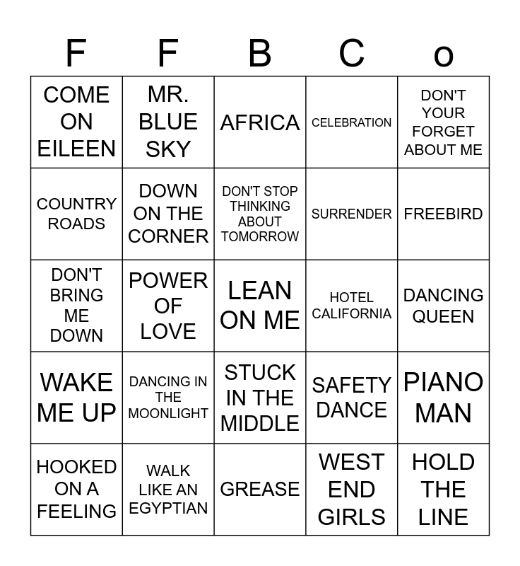 This bingo card has 80 words: 9 TO 5, ABC, AFRICA, ALL OUT OF LOVE, AMERICAN GIRL, ANY WAY YOU WANT IT, BEAST OF BURDEN, THE BOYS ARE BACK IN TOWN, BROKEN WINGS, CAN'T FIGHT THIS FEELING, CAN'T HURRY LOVE, CECILIA, CELEBRATION, COME ON EILEEN, COME SAIL AWAY, COUNTRY ROADS, CROCODILE ROCK, DANCING IN THE MOONLIGHT, DANCING ON THE CEILING, DANCING QUEEN, DON'T STOP BELIEVING, DON'T YOUR FORGET ABOUT ME, DON'T BRING ME DOWN, DON'T STOP THINKING ABOUT TOMORROW, DOWN ON THE CORNER, DOWN UNDER, ESCAPE (The Pina Colada Song), EVERY BREATH YOU TAKE, EYE OF THE TIGER, FOOTLOOSE, FREEBIRD, GIVE A LITTLE BIT, GREASE, HOLD THE LINE, HOOKED ON A FEELING, HOTEL CALIFORNIA, I WANNA DANCE WITH SOMEBODY, I'M SO EXCITED, KARMA CHAMELEON, LEAN ON ME, LET'S HEAR IT FOR THE BOY, LISTEN TO THE MUSIC, MAGGIE MAY, MANEATER, MESSAGE IN A BOTTLE, MR. BLUE SKY, NEVER GONNA GIVE YOU UP, NOTHING'S GONNA STOP US, DECEMBER 1963 (Oh What A Night), OLD TIME ROCK 'N' ROLL, PIANO MAN, POWER OF LOVE, SAFETY DANCE, SEPTEMBER, SIMPLE MAN, SIR DUKE, SOLSBURY HILL, SOMEBODY TO LOVE, STAYIN' ALIVE, STUCK IN THE MIDDLE, SURRENDER, SWEET HOME ALABAMA, TAKE ON ME, TARZAN BOY, BABA O'RILEY, THE CHAIN, THE WAY IT IS, THRILLER, UP AROUND THE BEND, UPTOWN GIRL, WAKE ME UP, WALK LIKE AN EGYPTIAN, WALKING ON SUNSHINE, WE ARE THE CHAMPIONS, WE BUILT THIS CITY, WE DIDN'T START THE FIRE, WEST END GIRLS, WHAT A FEELING, YOU'RE SO VAIN and YOU'RE THE ONE THAT I WANT.