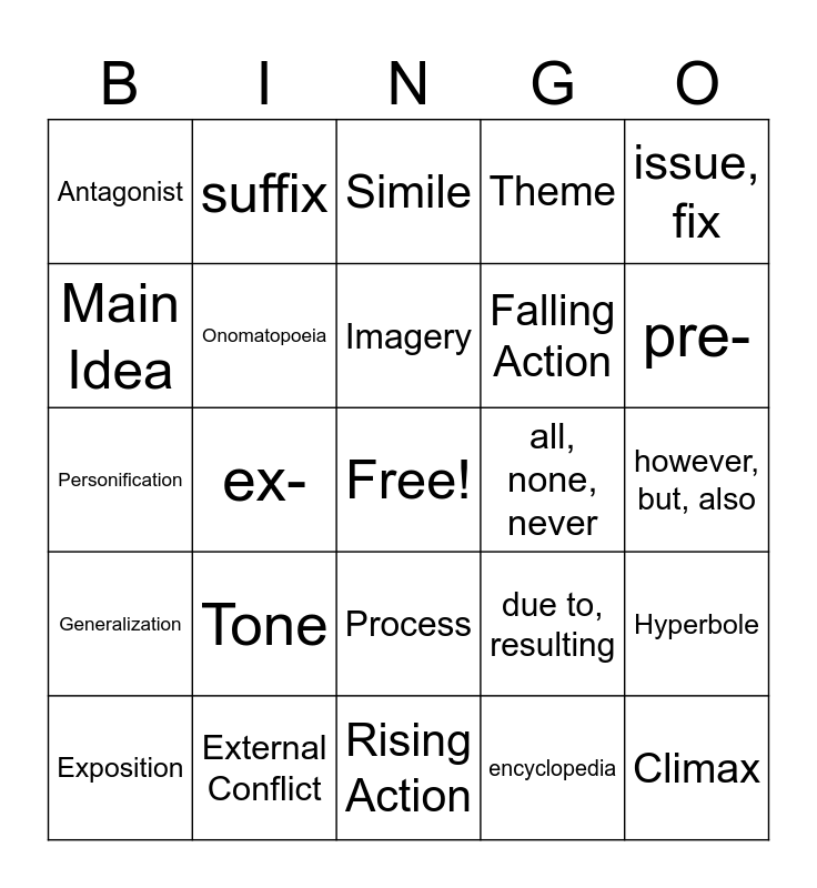 This bingo card has a free space and 54 words: Compares & Contrast, Generalization, Problem & Solution, Sequence, Process, Setting, Theme, Plot, Main Idea, Protagonist, Antagonist, Internal Conflict, External Conflict, Exposition, Inciting Event, Rising Action, Climax, Falling Action, Resolution, however, but, also, due to, resulting, first, second, last, all, none, never, issue, fix, prefix, suffix, context clues, atlas, dictionary, encyclopedia, thesaurus, draw conclusions or infer, Synonym, Antonym, Simile, Metaphor, Personification, Hyperbole, Alliteration, Onomatopoeia, Cause & Effect, Autobiography, Biography, Mood, Tone, Foreshadowing, 1st POV, 3rd POV, Imagery, ex-, pre-, un-, re- and sub-.