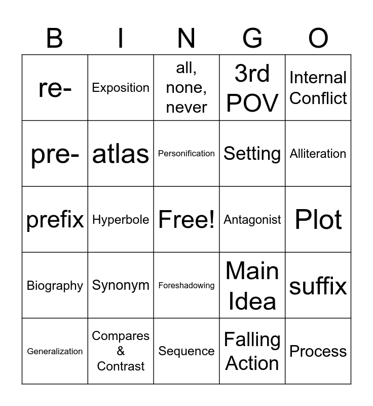 This bingo card has a free space and 54 words: Autobiography, Biography, Mood, Tone, Foreshadowing, 1st POV, 3rd POV, ex-, pre-, un-, re-, sub-, Compares & Contrast, Generalization, Problem & Solution, Sequence, Process, Setting, Theme, Plot, Main Idea, Protagonist, Antagonist, Internal Conflict, External Conflict, Exposition, Inciting Event, Rising Action, Climax, Falling Action, Resolution, however, but, also, due to, resulting, first, second, last, all, none, never, issue, fix, prefix, suffix, context clues, atlas, dictionary, encyclopedia, thesaurus, draw conclusions or infer, Synonym, Antonym, Simile, Metaphor, Personification, Hyperbole, Alliteration, Onomatopoeia, Cause & Effect and Imagery.