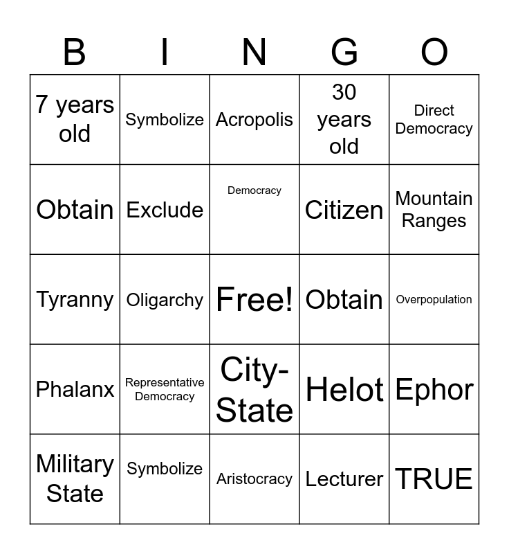 This bingo card has a free space and 29 words: Helot, Symbolize, Acropolis, Polis, Direct Democracy, 7 years old, Exclude, Democracy, Obtain, Ephor, Military State, Oligarchy, Lecturer, TRUE, Tyranny, Tenant Farmer, Aristocracy, Helot, Mountain Ranges, Phalanx, Representative Democracy, Metic, Citizen, Overpopulation, Obtain, Symbolize, City-State, 30 years old and 20 years old.