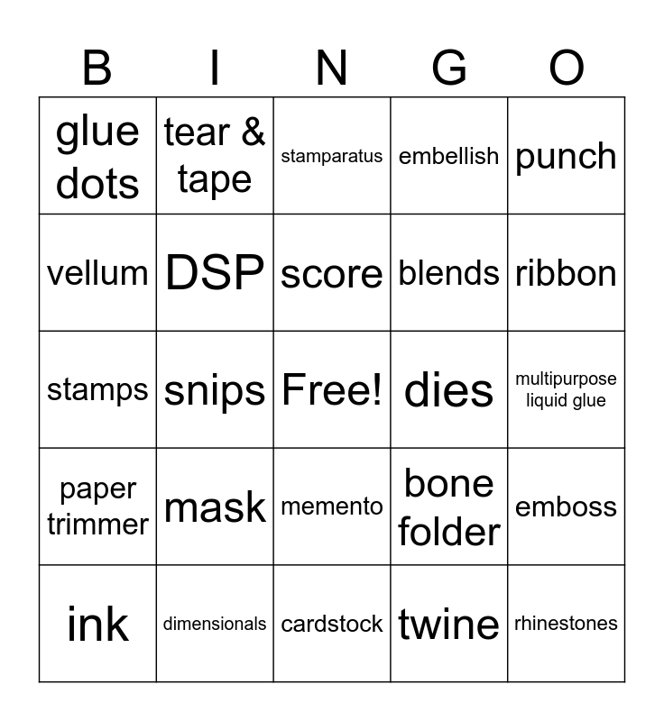 This bingo card has a free space and 24 words: ink, mask, score, twine, punch, glue dots, tear & tape, stamparatus, dies, multipurpose liquid glue, stamps, DSP, bone folder, emboss, vellum, dimensionals, cardstock, embellish, ribbon, paper trimmer, snips, memento, blends and rhinestones.