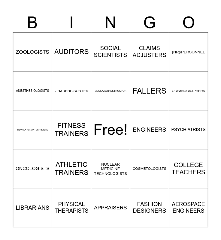 This bingo card has a free space and 47 words: ACTUARIES, AEROSPACE ENGINEERS, BROADCAST TECHNICIANS, APPRAISERS, ATHLETIC TRAINERS, AUDIOLOGISTS, AUDITORS, BIOCHEMISTS, ANESTHESIOLOGISTS, CARTOONISTS, GRADERS/SORTER, CLAIMS ADJUSTERS, COLLEGE TEACHERS, COSMETOLOGISTS, CURATORS, DENTAL HYGIENISTS, EDUCATOR/INSTRUCTOR, ENGINEERS, HUMAN RESOURCES, (HR)/PERSONNEL, FITNESS TRAINERS, FASHION DESIGNERS, ZOOLOGISTS, FALLERS, HYDROLOGISTS, OCEANOGRAPHERS, LIBRARIANS, LOAN OFFICERS, NUCLEAR MEDICINE TECHNOLOGISTS, ONCOLOGISTS, LAWYERS, ROOFERS, OUTDOOR GUIDES, OPHTHALMOLOGISTS, PHOTOGRAPHERS, PHYSICAL THERAPISTS, PSYCHIATRISTS, PARK RANGERS, WELDERS, VETERINARIANS, SALES/ MARKETING PROFESSIONALS, SOCIAL SCIENTISTS, TRANSLATORS/INTERPRETERS, RADIOLOGIC TECHNOLOGISTS, TOUR ESCORTS, REGISTERED NURSES (RNS) and CHEFS WEB DESIGNERS.