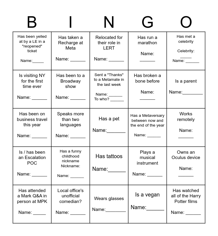 This bingo card has a free space and 24 words: Has a funny childhood nickname Nickname: Name: ______, Local office's unofficial comedian? Name: ______, Sent a "Thanks" to a Metamate in the last week Name: ______ To who? ______, Has attended a Mark Q&A in person at MPK Name: _____, Has met a celebrity Celebrity: _____ Name: ______, Has been yelled at by a LE in a "reopened" ticket Name:_____, Is visiting NY for the first time ever Name: ______, Has taken a Recharge at Meta Name: ______, Has a Metaversary between now and the end of the year Name: ______, Has tattoos Name:______, Has broken a bone before Name: ______, Has been on business travel this year Name: ______, Plays a musical instrument Name: ______, Owns an Oculus device Name: ______, Has been to a Broadway show Name: ______, Is a vegan Name:______, Works remotely Name: ______, Relocated for their role in LERT Name: ______, Is a parent Name:________, Speaks more than two languages Name: ______, Has watched all of the Harry Potter films Name: ______, Is / has been an Escalation POC Name: ______, Has run a marathon Name: ______ and Wears glasses Name:________.