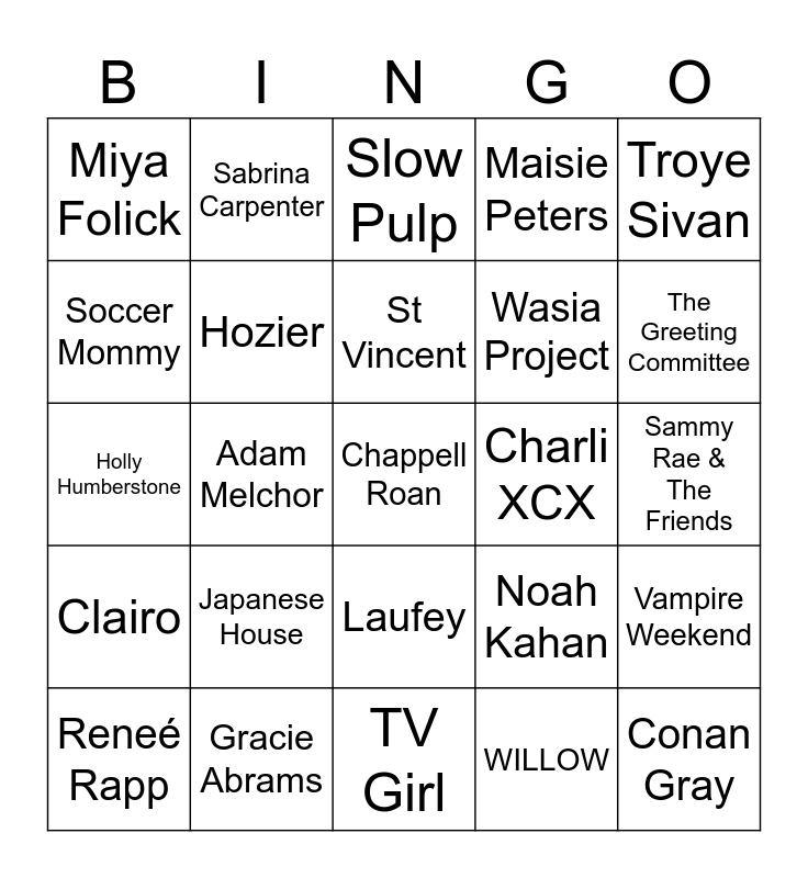 This bingo card has a free space and 24 words: Reneé Rapp, Japanese House, St Vincent, WILLOW, Troye Sivan, Miya Folick, Sabrina Carpenter, Slow Pulp, Charli XCX, Sammy Rae & The Friends, Holly Humberstone, Hozier, Noah Kahan, Vampire Weekend, Soccer Mommy, Gracie Abrams, TV Girl, Maisie Peters, The Greeting Committee, Clairo, Adam Melchor, Laufey, Wasia Project and Conan Gray.